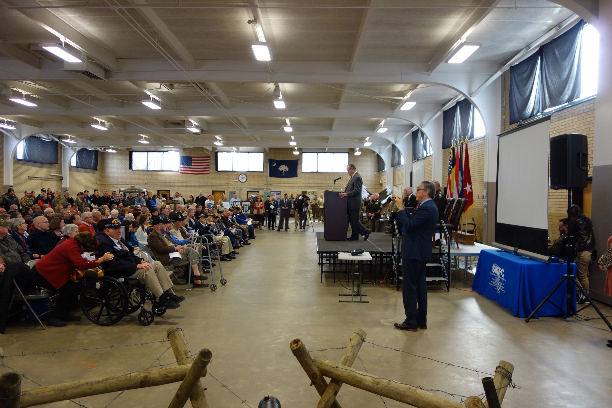 Building from the success of their June D-Day anniversary commemoration, the S.C. Military History Museum coordinated a Battle of the Bulge event. Here veterans of that battle are front row honorees. Governor Mc Master is being introduced as the key note speaker. You'll notice the Polish defensive position is guarding the left flank of the dignitaries.